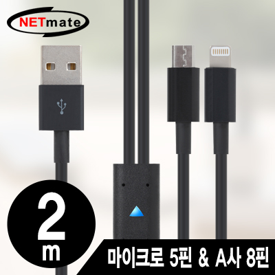 • 강원전자 넷메이트 마이크로 5핀 & A사 8핀 멀티 충전 케이블 2m(블랙/2 in 1) NMC-UL02BL
